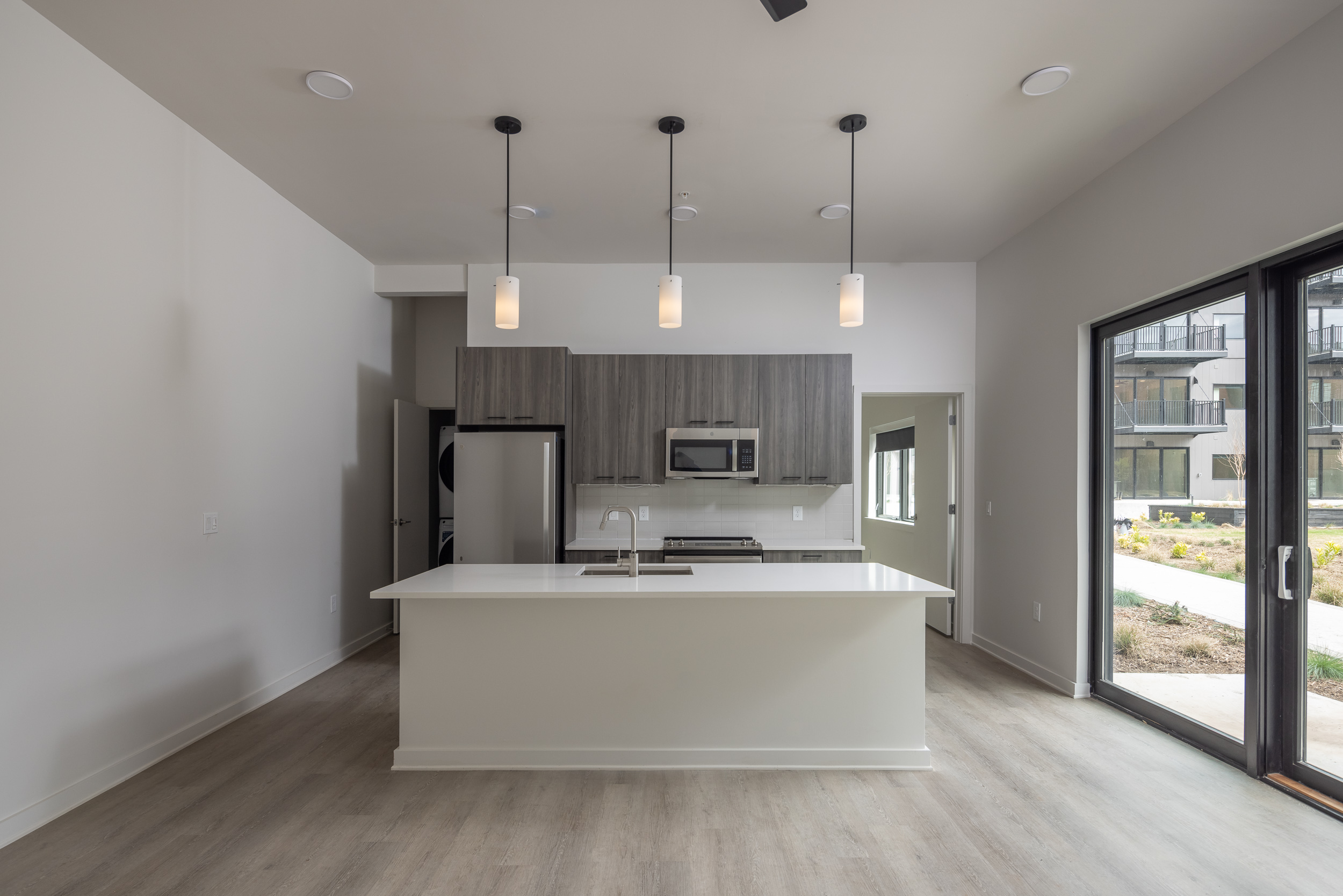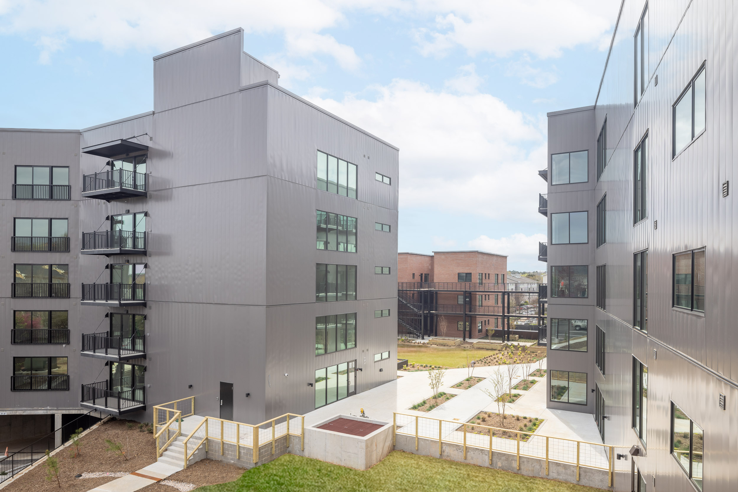 The development also features a two-level parking structure, providing over 190 spaces, and more than 20,000 square feet of retail space. At the heart of the community is a landscaped green roof, designed as a gathering place where residents can relax, study, and enjoy the outdoors. The result is a 157-bedroom apartment complex that blends residential, retail, and shared amenities into a modern urban living environment.