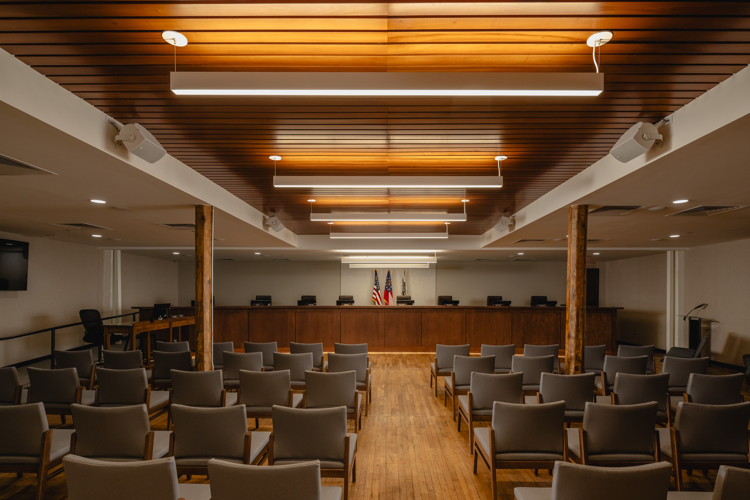 The second floor now features two large meeting rooms and new office space, while the first floor was redesigned with an open-concept layout that includes a custom bar, bistro dining, expanded commercial kitchen, upgraded fitness center, and modern front desk.