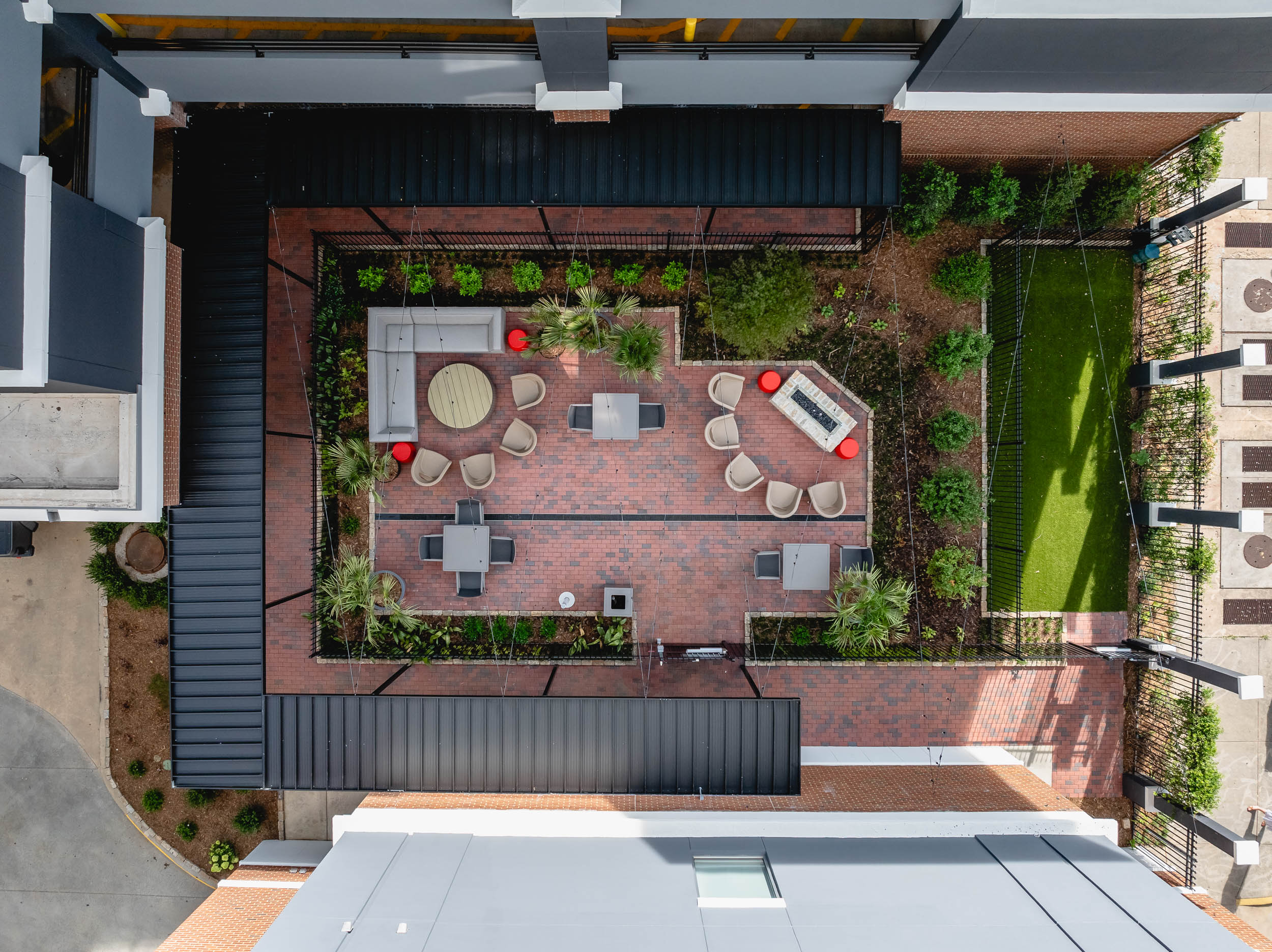 Exterior improvements included new paint, landscaping, and a redesigned courtyard with a fire pit, canopy, lounge seating, and a dog-walking area. The four-story parking deck was also upgraded with new lighting, EV charging stations, restriping, and refreshed stairwells.