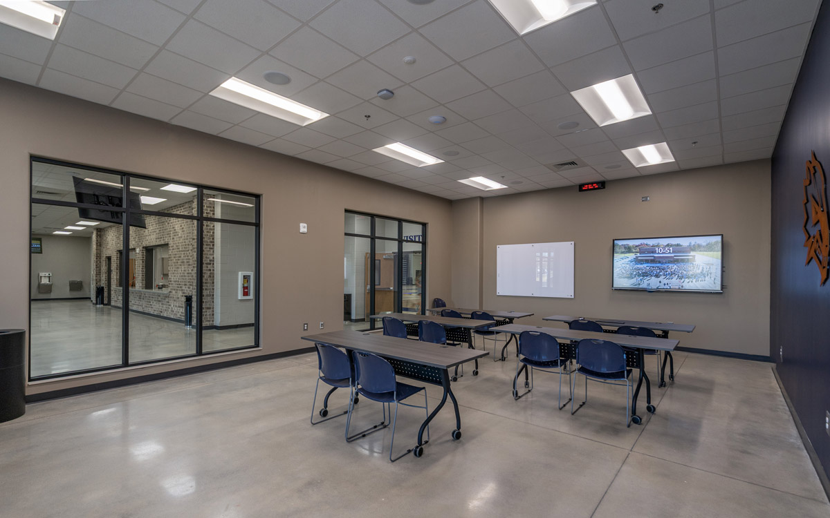 A flexible multipurpose room is integrated into the facility to accommodate team meetings, film review sessions, special presentations, and community events, further enhancing the gym’s functionality and its value as a shared school and community resource.